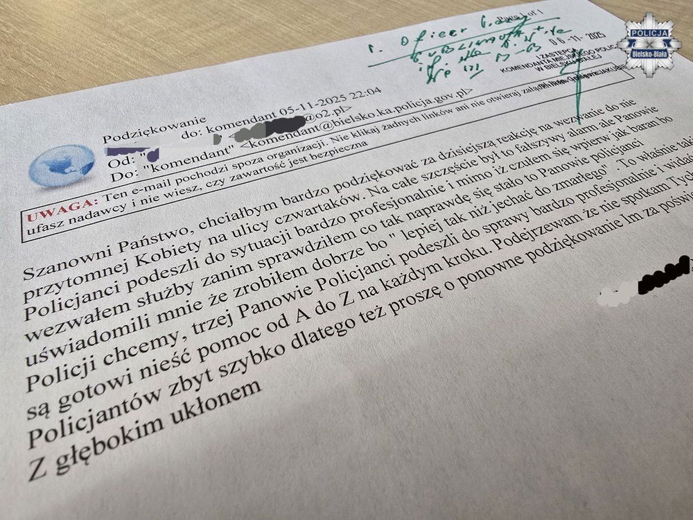 Na ręce Komendanta Miejskiego Policji w Bielsku-Białej wpłynęły oficjalne podziękowania za interwencję przeprowadzoną przez funkcjonariuszy z Komisariatu Policji III. Policjanci podjęli działania po zgłoszeniu mężczyzny zaniepokojonego brakiem kontaktu ze znajomą kobietą.