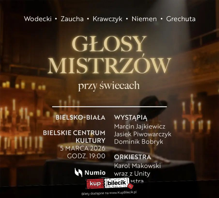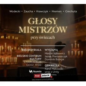 bilety: Zapraszamy na kameralny koncert w Bielskim Centrum Kultury - miejscu, które od lat gości najważniejsze wydarzenia muzyczne w regionie. 5 marca 2026 roku o godzinie 19:00 usłyszysz tu utwory legend polskiej sceny w nastrojowej oprawie światła świec. W programie znajdą się ponadczasowe kompozycje Zbigniewa Wodeckiego, Andrzeja Zauchy, Krzysztofa Krawczyka, Czesława Niemena i Marka Grechuty - w nowych aranżacjach autorstwa Karola Makowskiego, wykonanych przez Unity Orchestra. Dlaczego warto? Czeka na Ciebie 1,5 godziny nastrojowych, starannie przygotowanych aranżacji. Kiedy: 5 marca 2026 (czwartek) Głosy mistrzów przy świecach artyści: Jasiek Piwowarczyk, Marcin Jajkiewicz, Dominik Bobryk, Łukasz Reks, Karol MakowskiW programie znajdą się ponadczasowe kompozycje Zbigniewa Wodeckiego, Andrzeja Zauchy, Krzysztofa Krawczyka, Czesława Niemena i Marka Grechuty — w nowych aranżacjach autorstwa Karola Makowskiego, wykonanych przez Unity Orchestra. Bilety do nabycia na: KupBilecik.pl |