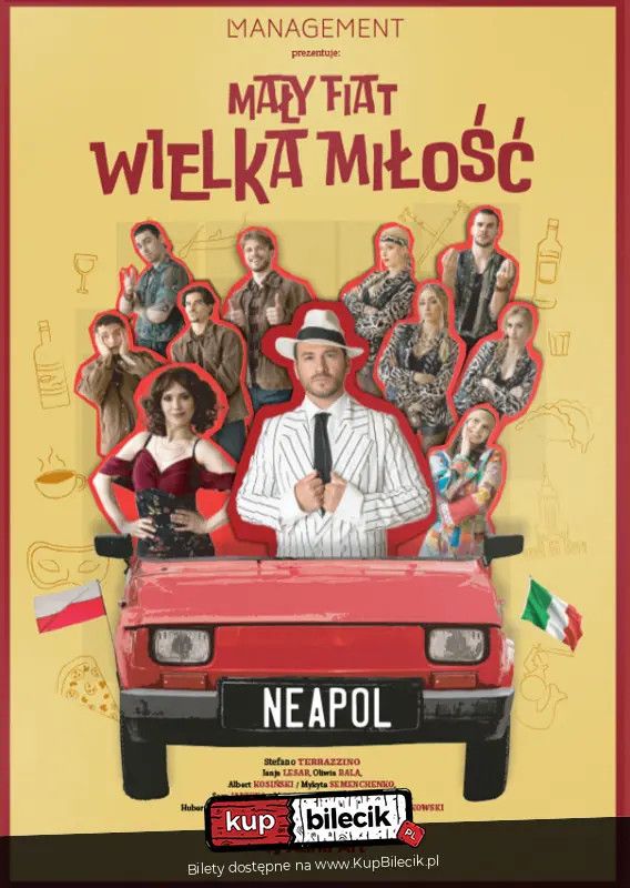 "Mały Fiat Wielka Miłość" to pełne pasji, radości, ale i zawirowań widowisko muzyczno-taneczne, które zabierze widzów w podróż do serca neapolitańskiej rodziny żyjącej w Polsce. W lekkiej, pełnej humoru formie historia o miłości, tradycji i rodzinnych więziach zostaje opowiedziana przez taniec oraz śpiew na żywo, które niosą ją z niezwykłą energią. W programie usłyszymy włoskie utwory takie jak "Piccola e Fragile", "Tu Vo Fa L"Americano", "Mambo Italiano", a także piosenki w języku polskim, które dodadzą wyjątkowego charakteru temu spektaklowi. Bilety do nabycia na: